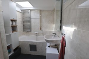 Achter de keuken via een tweede halletje komen we bij het separate toilet en de badkamer met ligbad, douchehoek, wastafel met grote spiegel, en voldoende kastruimte. Alles in mooie lichte kleur betegeld.