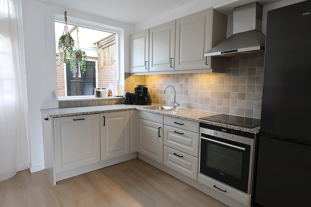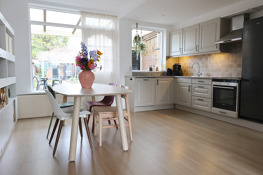 Ruime lichte woonkamer met een inbouw houtkachel in de schouw, achterin een tuingerichte keuken voorzien van diverse apparatuur en een bergkast onder de trap, een deur naar de achtertuin met een overkapping aan de woning waardoor je droog naar de vrijstaande berging loopt waarin de wasmachineaansluiting en nog voldoende ruimte als bijkeuken in gebruik is.